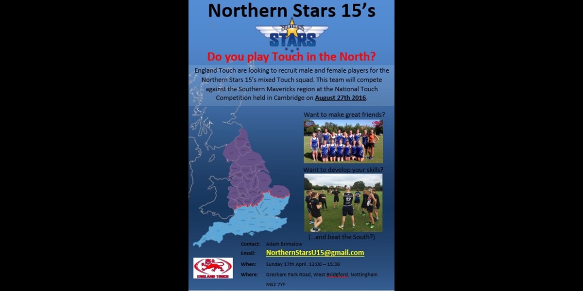 England Touch are looking to recruit male and female players for the Northern Stars 15’s mixed Touch squad. This team will compete against the Southern Mavericks region at the National Touch Competition held in Cambridge on August 27th 2016. Want to make great friends? Want to develop your skills?Fill in the below form.Loading... Further InfoContact: Adam BrimelowEmai ...
